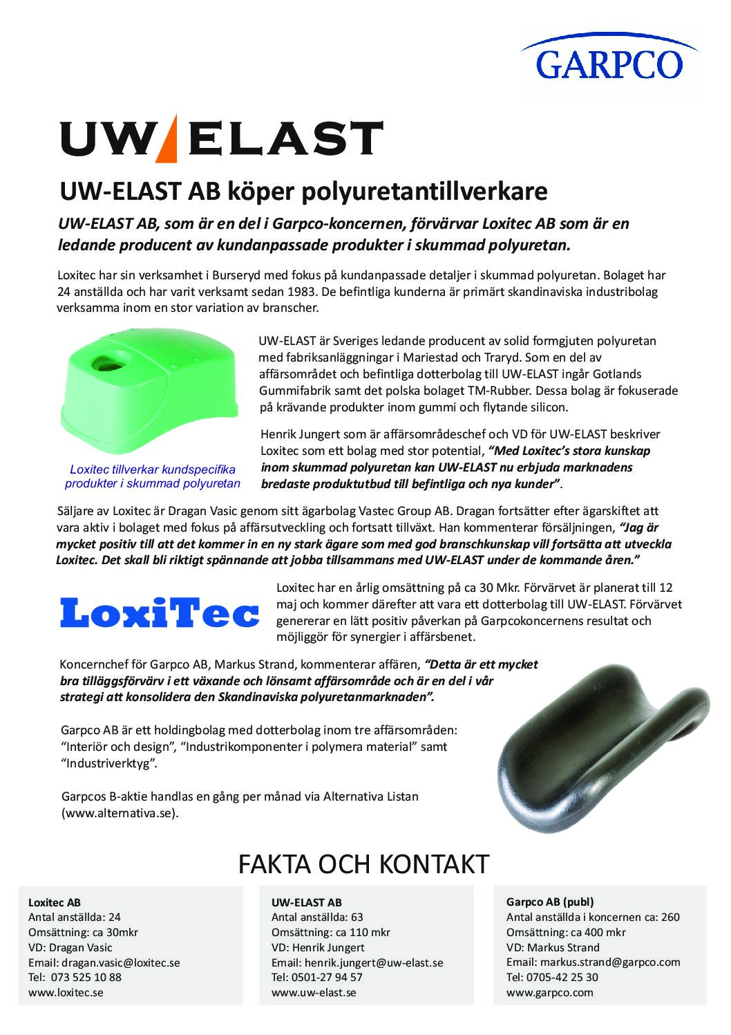 Nu är vårt senaste förvärv klart, Loxitec AB blir vårt dotterbolag fr.o.m. 12 Maj-2021. Loxitec har sin verksamhet i Burseryd med fokus på kundanpassade detaljer framförallt skummad polyuretan. Bolaget har 24 anställda och har varit verksamt sedan 1983. Deras kunder är primärt skandinaviska industribolag verksamma inom en stor variation av [...]